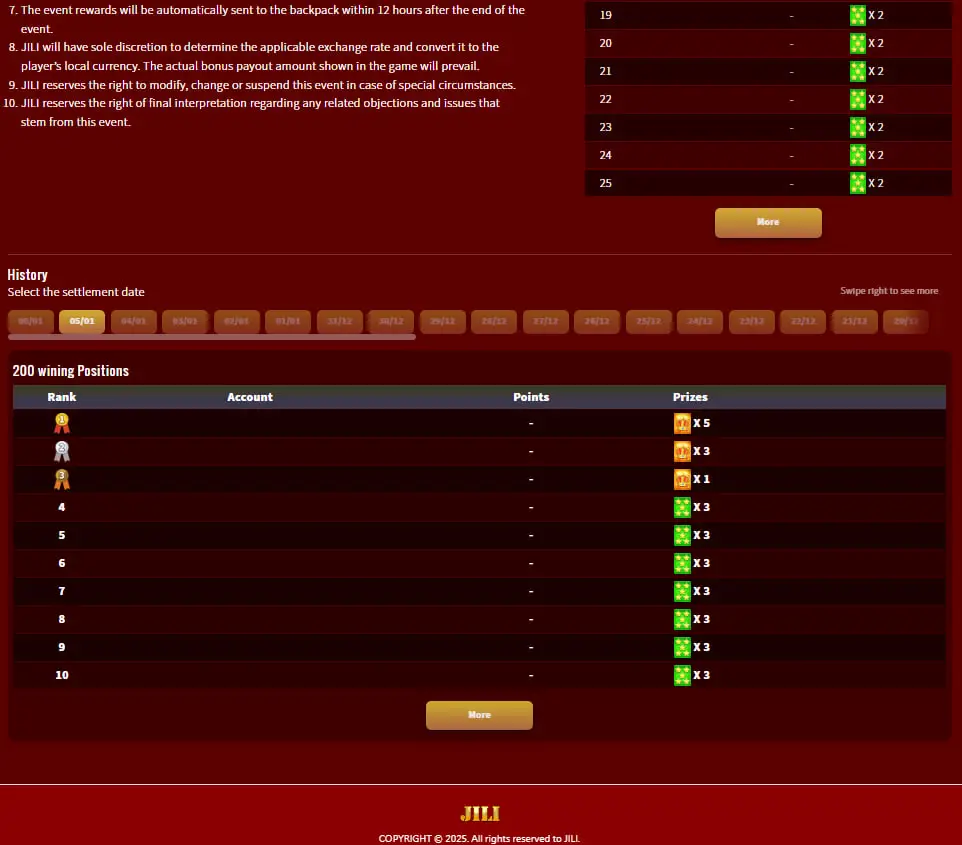 1. Ranking period of the day is 00:00:00~23:59:59 and the highest amounts for a specified period of time is a daily winner.